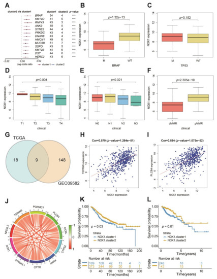 To further investigate each cluster’s mutation genes, we determined 13 significantly differentially mutation genes. Notably, BRAF mutation is more frequent in cluster1 (Figure 4A). In metastatic colorectal cancer (mCRC), BRAF mutation represents a poor prognostic factor and median survival [19]. Combined with the previous results that NOX1 had significantly lower expression in cluster1, we suspected that the poor survival of cluster1 with low expression of NOX1 may be related to BRAF mutation. Next, we explored the relationship between NOX1 genes and clinical factors. Surprisingly, the BRAF wild-type group had a high expression of NOX1 (Figure 4B). We also observed that NOX1 is related to the T/N stage and the state of MMR (Figure 4C–F). The above results showed that the patients in early colon cancer stages and fewer BRAF mutations had high expression of NOX1, consistent with previous results that the patients with higher NOX1 expression had a better survival. Furthermore, we explored the genes related to NOX1 in both the GEO39582 and TCGA databases. Then, we obtained nine genes (NFE2L3, TSPAN6, PGRMC1, PLCB4, OCRL, CTPS2, XKRX, CFTR, ST6GAL1, NOX1), among which TSPAN6 and PLCB4 are most relevant (Figure 4G–J and Figure S4A–G). To further verify that NOX1-related genes are related to survival, based on the obtained 9 NOX1-related genes and NOX1, unsupervised clustering analyses were performed to further validate that these genes are related to survival. Finally, we found these genes can distinguish survival in both the GSE39582 and TCGA databases (Figure 4K,L). Therefore, NOX1 and COX2 (PTGS2) both play key roles in cancer development via the generation of an inflammatory microenvironment [20]. We next investigated the relationship between NOX1, COX2, and BRAF mutations. We found the expression of NOX1 is negatively related to COX2. In the BRAF wild group, the expression of NOX1 was high, while the expression of COX2 was low (Figure S4J–L). Previous studies showed that COX2 inhibitors, such as nonsteroidal anti-inflammatory drugs (NSAIDs), may decrease the risk and improve prognosis of carcinogenesis of various types of cancer including colorectal cancer [21,22,23,24]. The above results showed that NOX1 genes played a non-negligible regulation role in survival.