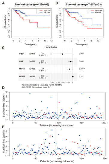 Cox regression model results in TCGA. (A) The survival curves of the ferroptosis risk score in the training set. Grouping was based on the median ferroptosis risk score in the training set. Red is the high-level group, and blue is the low-level group. (B) The survival curves of the ferroptosis risk score in the test set. Red is the high-level group, and [8] blue is the low-level group. Grouping was based on the median ferroptosis risk score in the training set. (C) A forest plot of the multivariate Cox regression model. Hazard ratio is provided in the figure (* p < 0.05). (D) Patients’ survival status in the training set. The x-axis is the patient ranking in ascending order by the ferroptosis risk score; the y-axis is the survival time. The red dots represent the patients who died, and the green dots represent the surviving patients. (E) Patients’ survival status in the test set. The x-axis is the patient ranking in ascending order by the ferroptosis risk score; the y-axis is the survival time. The red dots represent the patients who died, and the green dots represent the surviving patients.