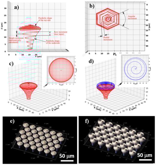 For structure design, the 3D lithography Nanoscribe installation requires an ordered list of Cartesian points that describe the path followed by the voxel during the laser writing process. We designed hierarchical structures based on an iterative algorithm that calculated the coordinates of each point of the structure consecutively and where the laser path followed a spiral shape. To evaluate the Cartesian coordinates of each point, the equation of an ellipse was used. For the following point, the parameters of the equation were each modified with a specific incremental value (radius, height, and angle). In order to obtain structures with circular symmetry in the XY plane, an angular increment of 3° between consecutive points was employed. The software was written such that the user inputs the total height of the structure and the height step of consecutive spirals (row increment). As such, radial and height increments were automatically calculated to accommodate the given geometric characteristics. The concept of the design is illustrated in Figure 1a,b.