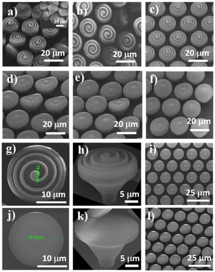 For a set of structures (denominated microstructured mushroom-like pillars—MMP), a spiral wall on the outer surface of the top side was added (i.e., on the mushroom’s hat) (Figure 1d). The spiral followed the parabolic surface of the top side, but the radial step was significantly increased in order to obtain separated walls. In order to separate the walls of the spiral, the row height was increased to 6 times the row height of the top side (i.e., to 1.2 µm). For both MMP and NMP structures, the topographical gradients provided by variable spiral steps over the hats of the mushroom-like structures are expected to provide an efficient means to control the degree of overlapping in order to obtain a high control over the aspect ratio of the micro- and nanostructures.