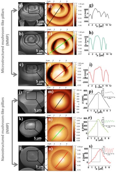Scanning electron micrographs (a–c,j–l), atomic force microscopy images (d–f,m–o) and line profiles measured from AFM images (g–i,p–s) of micro- and nanostructured mushroom-like pillars (MMP and NMP). Laser writing parameters: (a,j) laser speed 140 µm/s, laser power 13.8 mW; (b,k) laser speed 120 µm/s, laser power 12.5 mW; (c,l) laser speed 100 µm/s, laser power 12.5 mW.