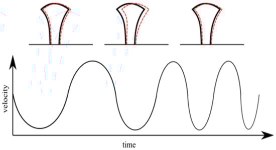 Schematic representation of the resonant oscillations of the mushroom-like pillars determined by the stage movement.