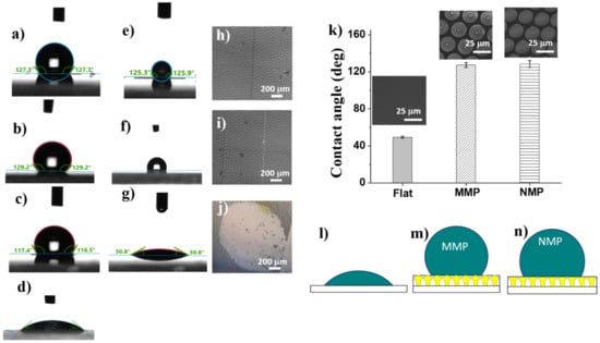 To find out the reasons for the hydrophobic character of the NMP and MMP structures, we looked in more detail into the surface morphology of the samples, as revealed by SEM and AFM images from Figure 3. Although the scales of the structuring differed by 10 orders of magnitude, i.e., from micrometers for MMP to nanometers for NMP, the surface roughness of both MMP and NMP structures seemed to be sufficient to achieve hydrophobicity. The wettability changed from hydrophilic on flat polymer surfaces, having the contact angle of (43 ± 1)° (Figure 5d), to hydrophobic on MMP and NMP surfaces, which showed contact angles of (127 ± 2)° and (128 ± 4)° respectively (Figure 5a,b). Most likely, the mushroom-like structures trapped air underneath the mushrooms’ hats while limiting the penetration of water, as schematically illustrated in Figure 5l–n.