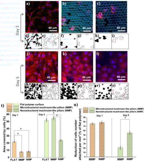 Representative fluorescence microscopy images of OLN-93: (a,j) flat polymer surface; (b,k) microstructured mushroom-like pillars (MMP); (c,l) nanostructured mushroom-like pillars (NMS), after one and 5 days of cell culture. Colors: cytoskeleton: F-actin (red); nuclei: Hoechst-blue; structures’ autofluorescence-green. (d,f,h,m,o,r) black-and-white masks identifying the cells on surfaces from (a–c,j–l) after one and 5 days of cell culture; (e,g,i,n,p,s) contour lines indicating the outline of each cell from (a–c,j–l), after one and 5 days of cell culture; (t) Area covered by cells as % from 1 × 1 mm2 surface after one and 5 days of cell culture; (u) Cells number per 1 × 1 mm2 surface, calculated as percent of flat polymer surface (control), after one and 5 days of cells culture. * corresponds to p ≤ 0.05 as specified in the Section 3.5.