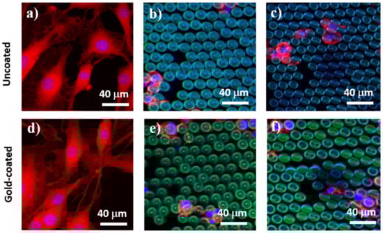 Representative fluorescence microscopy images of cells cultured for 24 h on: (a,d) flat polymer surface; (b,e) microstructured mushroom-like pillars (MMP); (c,f) nanostructured mushroom-like pillars (NMS). Cytoskeleton: F-actin (red); nuclei: Hoechst (blue); structures’ autofluorescence (green). Upper panel: uncoated samples. Lower panel: samples coated with 14 nm layer of gold.