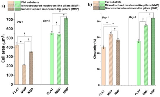 (a) Cell area and (b) circularity of cells cultured on: flat surfaces, microstructured mushroom-like pillars (MMP), and nanostructured mushroom-like pillars (NMP), after 1 and 5 days of cell culture. The measurements were performed using fluorescence images from Figure 6 and Image J software. A circularity of 100% corresponds to a circle. * corresponds to p ≤ 0.05 from the Section 3.5.