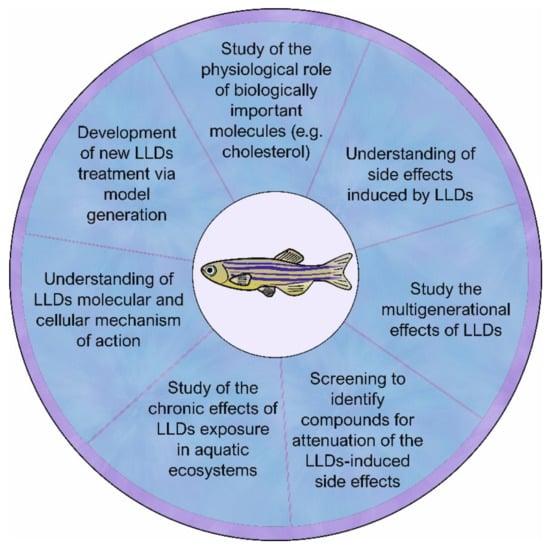 These considerations seem to support the usefulness of the zebrafish model for studying many aspects related to the need for widespread use of LLDs in humans (Figure 1). This concerns both the mechanisms of action of these drugs together with the study of adverse effects caused by them, as well as generating models that allow the development of new, safer, and more effective therapies to replace the old generation of drugs. The numerous advantages of zebrafish also make it well suited for studying phenomena involving environmental issues and resulting from the massive use of LLDs worldwide.