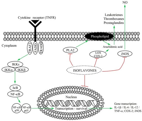 The effects of isoflavones in inflammation. TRAF2—tumor necrosis factor receptor associated factor-2, FADD—Fas-associated death domain protein, TRADD—TNFR1-associated death domain protein, IκB—inhibitory factor kappa B, IKK—IκB kinase, NF-κB—nuclear factor of kappa light polypeptide gene enhancer in B-cells, NO—nitric oxide, PLA2—phospholipase A2, LOX—lipoxygenase, COX-2—cyclooxygenase-2, iNOS—inducible nitric oxide synthase, IL—interleukin, TNF-α—tumor necrosis factor alpha. Green arrow—activation, up-regulation; red arrow—blocking, down-regulation.