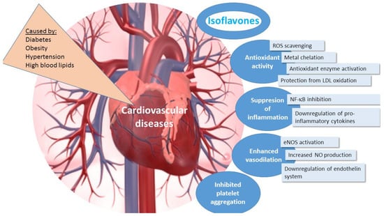 Cardiovascular diseases: hypertension, dyslipidemia, coronary heart disease, and heart insufficiency are among the main causes of death in the world []. A soy-rich diet (at least 25 g of soy protein daily) has been shown to reduce the risk of cardiovascular diseases [,,]. The beneficial activity of isoflavones for heart has been linked to their antioxidant, anti-inflammatory activities, enhanced vasodilation and inhibited platelet aggregation (Figure 5) thus preventing thrombosis and occlusion of blood vessels [,].