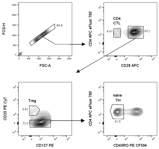 Sort strategy to sort three populations simultaneously: naïve TH, cytotoxic CD4 T cells (CD4 CTL) and regulatory T cells (Tregs). Prior to sorting, the total CD4+ T cell fraction is isolated from fresh PBMCs using magnetic beads. On the CD4+ T cell fraction, single cells are gated, using the area and height of the forward scatter (FSC-A, FSC-H). Next, CD4+CD28+ and CD4+CD28– (CD4 CTL) cells are gated. Within the CD4+CD28+ gate, Tregs are gated as CD25hiCD127–. Finally, naïve TH are gated within the CD127+ population as CD45RO–.
