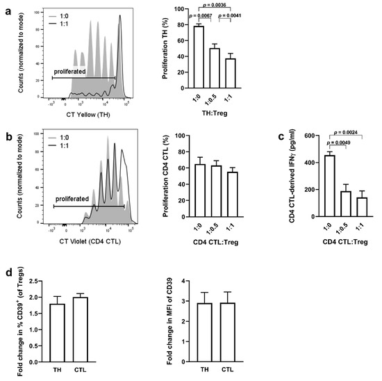 Cytotoxic CD4+ T cells are resistant to Treg-mediated suppression of proliferation, but not to Treg-mediated inhibition of IFN-γ production. (a–c) Representative flow cytometry plot and cumulative data of TH cell proliferation (a) when co-cultured with Tregs. Representative flow cytometry plot and cumulative data of CD4 CTL cell proliferation (b) and production of IFN-γ (c) when co-cultured with Tregs. Error bars indicate mean ± SEM for n = 7 donors from seven independent experiments; data analyzed by repeated measures one-way ANOVA, post hoc Tukey. (d) Fold change in % of CD39-expressing Tregs and median fluorescent intensity (MFI) of CD39 on Tregs when co-cultured with naïve TH or CD4 CTL. Data are calculated as fold change of CD39 expression in Tregs cultured alone. Error bars indicate mean ± SEM for n = 7 donors from seven independent experiments; data analyzed by paired t-test.