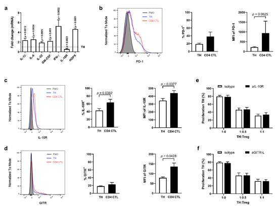 Next, the ex vivo protein expression of the surface molecules IL-10R, glucocorticoid-induced TNFR-related protein (GITR) and programmed cell death protein 1 (PD-1) was analyzed on CD4 CTL and CD28+ TH cells. At protein level, the expression of IL-10R was increased on CD4 CTL (Figure 3c). Frequency of GITR-expressing cells did not differ between subsets, although the MFI of GITR was increased on CD4 CTL (Figure 3d). The MFI of PD-1 tended to be increased on CD4 CTL, although the difference in the amount of cells expressing PD-1 did not reach significance (Figure 3b). To further investigate whether IL-10R and GITR expression play a role in resistance to suppression by Tregs in our in vitro suppression assay, co-cultures were performed with naïve TH Tresp with the addition of neutralizing antibodies directed against IL-10R or GITR-ligand (GITR-L; expressed on feeder cells present in the co-culture assay). Blocking IL-10R on naïve TH or blocking GITR-L on feeders did not result in decreased suppression by Tregs (Figure 3e,f), making it unlikely that these two molecules are involved in the resistance of CD4 CTL to Tregs.