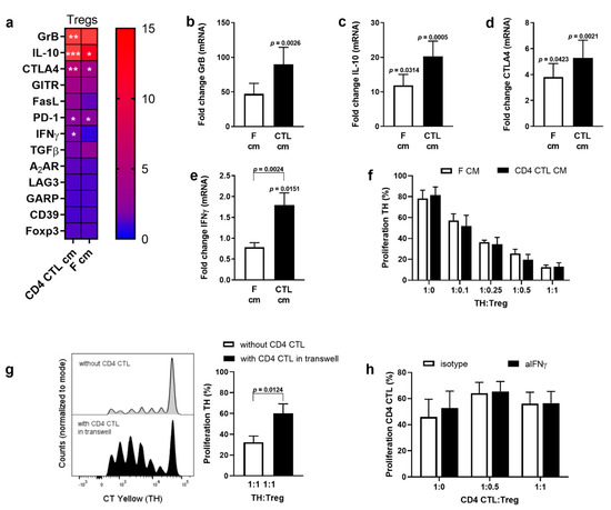 Next, we investigated the effect of CD4 CTL on Tregs in more detail. When Tregs were activated in the presence of the conditioned medium (CM) of CD4 CTL or feeders, mRNA expression of Granzyme B, IL-10, PD-1, and CTLA-4 increased (Figure 4a–d). Gene expression of IFN-γ in Tregs was induced by CM of CD4 CTL, but not by CM of feeder cells (Figure 4e). Gene expression of other functional molecules thought to be involved in Treg-mediated suppression (Foxp3, GITR, FasL, TGFβ, A2AR, LAG3, GARP, CD39) did not change significantly compared to direct ex vivo levels. To investigate whether the observed changes in gene expression of regulatory markers affected Treg functionality, a co-culture was performed of naïve TH Tresp with Tregs pre-exposed to CM of CD4 CTL. There was no difference in the suppressive capacity of Tregs treated with CM of CD4 CTL or with CM of feeders (Figure 4f). Next, we expanded the suppression assay with a transwell system to study the effect of the CD4 CTL secretome on the suppressive capacity of Tregs towards naïve TH Tresp more directly. The setup of the transwell assay is depicted in Figure 5a. The presence of CD4 CTL in the upper well (no cellular contact) reduced Treg-mediated suppression of naïve TH cells in the bottom well (Figure 4g). Finally, to investigate whether the increase in IFN-γ mRNA in Tregs explained their lack of suppression of cytotoxic CD4 T cells [31,32], Tregs were incubated with neutralizing antibodies directed against IFN-γ prior to co-culture with CD4 CTL. Neutralizing Treg-derived IFN-γ did not reinstall Treg-mediated suppression of CD4 CTL (Figure 4h), while ELISA data of the co-culture supernatant confirmed that all secreted IFN-γ was neutralized (<4 pg/mL).