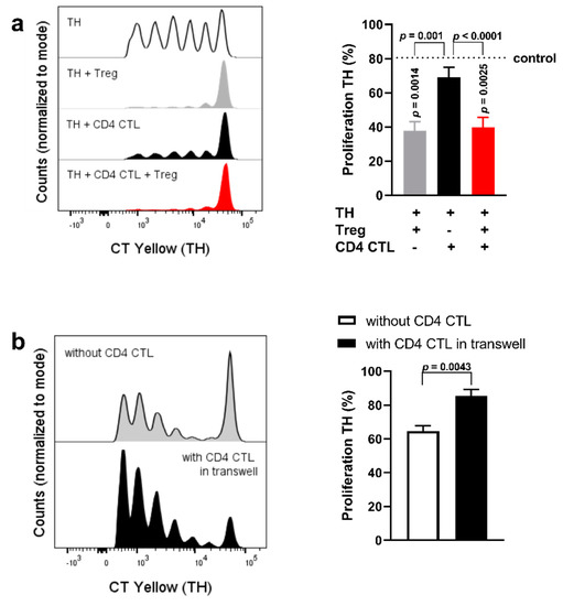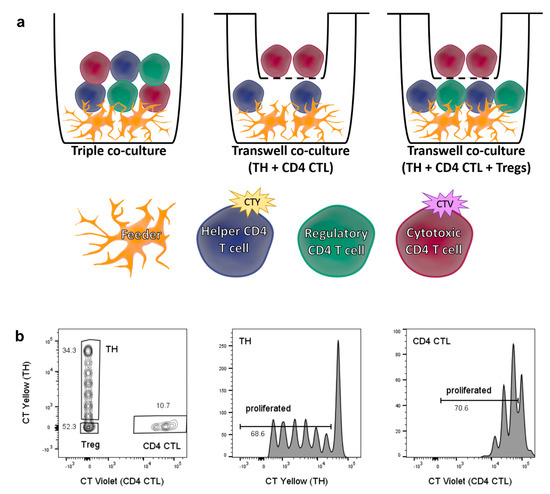 To better understand the interaction between CD4 CTL, CD28+ TH cells and Tregs, co-culture assays were performed with these three cell types simultaneously. Additionally, CD4 CTL and naïve TH cells were co-cultured in a transwell system. The experimental setup is depicted in Figure 5a (left and middle panel). This allowed us to analyze CD4 CTL-mediated effects facilitated by cell−cell contact. For the triple co-culture setup, sorted naïve TH cells labeled with CellTrace Yellow, CD4 CTL labeled with CellTrace Violet, and unlabeled Tregs were cultured together and analyzed after five days, with the different labeling dyes permitting for gating of all three subsets (Figure 5b).