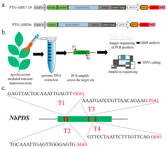Overview of A-to-G base editing by different ABEs in N. benthamiana. (a) Schematic depicting the PTG-ABE7.10 and PTG-ABE8e structure. NLS, nuclear localization sequence. (b) Assay scheme of agrobacterium-mediated transient expression and base-editing identification. F1/R1 indicates binding sites of the primers used for species-specific PCR amplification. (c) Schematic illustrating the four sgRNAs targeting the NbPDS gene. Red letters indicate the PAM sequence of gRNA.