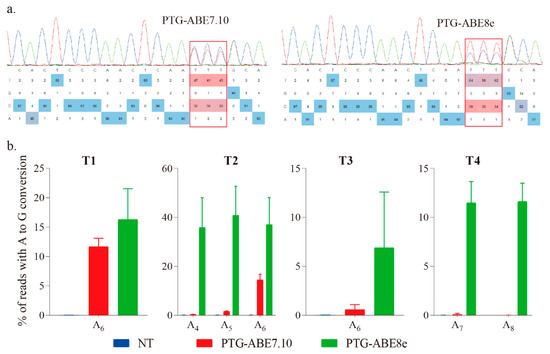 Estimation of A-to-G base editing induced by PTG-ABE7.10 and PTG-ABE8e in N. benthamiana. (a) Sanger sequencing chromatograms of the T2 target for PTG-ABE7.10 and PTG-ABE8e. The sequencing chromatograms show the results sequenced from the reverse direction. Red squares indicate the edited bases induced by ABEs. (b) Frequencies of A-to-G conversions induced by PTG-ABE7.10 and PTG-ABE8e at four target sites based on amplicon deep sequencing results. Frequencies (mean ± SEM) were calculated from three independent experiments (n = 3). NT, no-treatment.