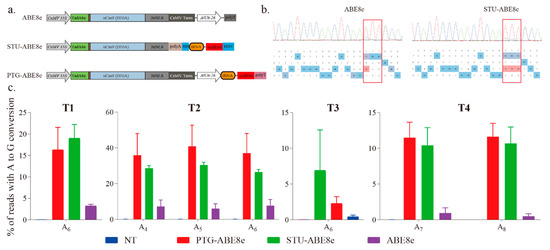 We further used three sgRNA expression cassettes to investigate the effects of sgRNA expression cassette on the editing efficiency of ABE8e (Figure 3a). The expression cassette of ABE8e is a regular expression cassette used in previous studies [14,15,19]. The cassette of STU-ABE8e combined the sgRNA and Cas9 into a single transcript unit (STU) (Figure 3a). The four targets described above were applied to compare different sgRNA expression cassettes (Figure 1c). The sequencing chromatograms of corresponding PCR products indicated that all the three ABE8e constructions successfully induced A-to-G conversions (Figure 2a and Figure 3b). Further, editing efficiencies of three ABE8e for all four targets were estimated using the deep amplicon sequencing. Editing efficiencies of both PTG-ABE8e and STU-ABE8e were significantly higher than that of ABE8e (Figure 3c). The editing efficiency of PTG-ABE8e was slightly higher than that of STU-ABE8e (Figure 3c). Those results verified that both PTG and STU expression cassette could enhance the editing efficiency of ABE8e in N. benthamiana. The on-target indel frequencies induced by three ABE8e constructions in the four targets were lower than 0.1%, indicating that ABE8e could facilitate precise A-to-G conversion with low byproducts (Figure S2).