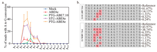 The sequences of TadA8e and TadA7.10 with a 96-bp linker were codon-optimized using JCat (http://www.jcat.de/, accessed on 12 September 2019) and commercially synthesized (Genewiz, Suzhou, China). All ABE constructs were modified from the vector pPTG-sgRNA-Cas9-U6-1 [24]. The fragment containing nCas9-3xNLS was amplified and replaced the segment between the BamHI site and the SpeI site in the vector pPTG-sgRNA-Cas9-U6-1 forming the vector PTG-nCas9. The TadA8e coupling with the linker was amplified and inserted into the vector PTG-nCas9 forming the PTG-ABE8e construct. The TadA-TadA7.10- linear fragment was inserted into the vector PTG-nCas9 generating the PTG-ABE7.10 construct. The fragment containing AtU6-26 promoter, two BsaI sites, gRNA scaffold, and polyT replaced the sequences between the two AscI sites in the vector PTG-ABE8e forming ABE8e. The fragment containing hammerhead (HH) ribozyme, two BsaI sites, gRNA scaffold, and hepatitis delta virus (HDV) ribozyme was synthesized and inserted into the vector PTG-ABE8e forming STU-ABE8e-inter construct. The STU-ABE8e-inter vector was digested by AscI and ligated using T4 DNA ligase generating STU-ABE8e construct.