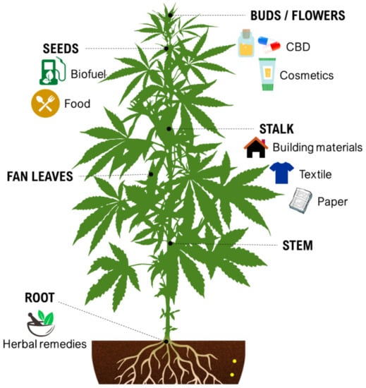 During the last decade, the industrial properties of cannabis (Figure 1) for applications in textiles, paper, building materials, cosmetics, and foods [,,], as well as pharmacological properties (Table 1) such as the palliation of chronic pains associated with cancer, neutralizing the adverse impacts of chemotherapy with cytostatic drugs, eating disorders related to anorexia and AIDS, inflammatory diseases, epilepsy, and anti-spastic activity in Tourette’s syndrome or sclerosis multiplex cases have been broadly studied and supported [,].
