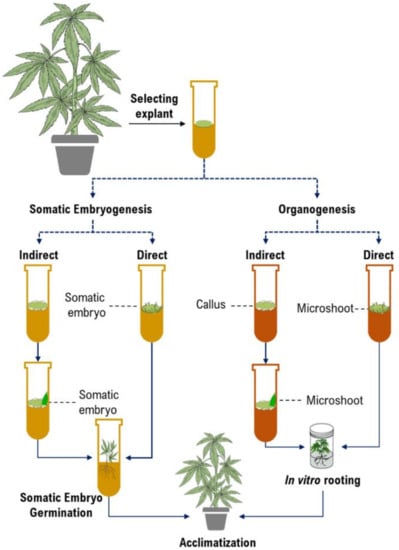Micropropagation is the first and foremost application of in vitro culture in cannabis [,,,]. While micropropagation for applications in genetic preservation or propagation are generally achieved through shoot proliferation from existing meristems, many applications in biotechnology require the establishment of de novo regeneration in which plants are produced from non-meristematic tissues. Somatic embryogenesis and organogenesis through either direct or indirect regeneration are the most important platforms for developing regeneration protocols (Figure 2). Although somatic embryogenesis is considered the ideal approach since they regenerate from single cells and reduce chimerism in transformed plants [], it has been rarely achieved in cannabis. Table 2 represents callogenesis and organogenesis studies in cannabis to date. As can be seen in Table 2, most studies have investigated the effects of plant growth regulators (PGRs) and type of explants and genotypes on micropropagation of cannabis. However, there are many factors (e.g., medium composition and incubation conditions, discussed in the following sections) that affect cannabis micropropagation. Therefore, it is necessary to study these factors for obtaining high-frequency protocols.