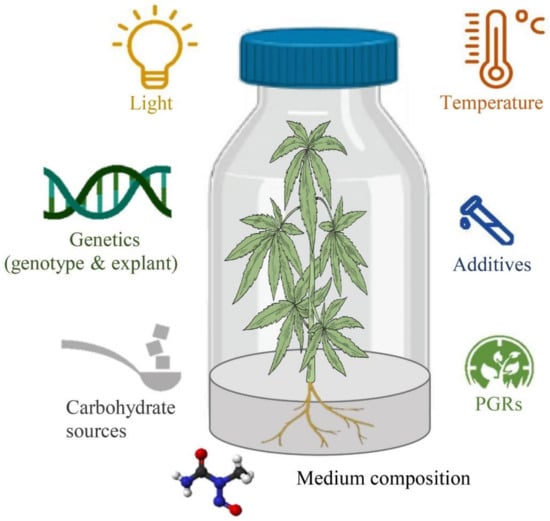 Despite advances in in vitro cell and tissue culture of cannabis in recent years, efficient cannabis regeneration remains one of the main obstacles to applying biotechnology for cannabis improvement and the species is generally considered to be relatively recalcitrant []. Genotypes, type and concentration of PGRs, size, age, and type of explant, gelling agent, carbohydrate sources, type and concentration of macro- and micro-nutrients, type and concentration of vitamins, type and concentration of additives (casein hydrolysate, nanoparticles, phloroglucinol, activated charcoal, etc.), pH of the medium, type and volume of the vessels, volume of the medium per culture vessels, and culture conditions (intensity and quality of the light, temperature, photoperiod, and light source) are the most important factors affecting in vitro culture systems [,] (Figure 3). However, most studies have investigated the effects of PGRs and the type of explants and genotypes on cannabis micropropagation and little information on many other factors is available. Therefore, studying other factors may result in high-frequency regeneration systems or even obtaining somatic embryogenesis and haploid production protocols. In this section, several promising strategies for improving in vitro culture protocols have been highlighted based on the mentioned factors, new computational methodologies such as machine learning algorithms, and new genetic engineering methods.