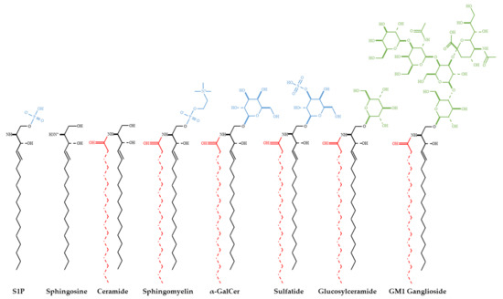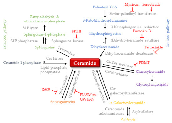 - Gault, C.R.; Obeid, L.M.; Hannun, Y.A. An overview of sphingolipid metabolism: From synthesis to breakdown. Adv. Exp. Med. Biol. 2010, 688, 1–23. [Google Scholar] [CrossRef]