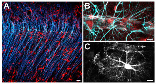 - Muller, T.; Fritschy, J.M.; Grosche, J.; Pratt, G.D.; Mohler, H.; Kettenmann, H. Developmental regulation of voltage-gated K+ channel and GABAA receptor expression in Bergmann glial cells. J. Neurosci. 1994, 14, 2503–2514. [Google Scholar] [CrossRef]
