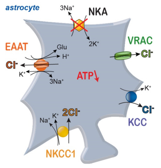 All astrocytic anion transport processes are controlled by parameters that are expected to change during brain ischemia. As discussed above, energy restriction will reduce the activity of the NKA and consequently Na+ and K+ gradients across glial membranes. The resulting membrane depolarization increases ambient glutamate concentration under ischemic stress. The consequences on glial [Cl−]i however, can at present not be decisively predicted. There is convincing data that demonstrates NKCC1-mediated Cl− accumulation in astrocytes under ischemic conditions [143,216,217,218,219,220]. The expected ischemia-associated drop in astrocytic [K+] would, however, also stimulate Cl− outward transport by KCCs. EAAT anion channels will be stimulated by increased extracellular glutamate, but the astrocytic depolarization might invert Cl− efflux into Cl− influx. Finally, since [Cl−]i is in dynamic equilibrium between Cl− accumulation and outward transport/efflux, the consequences of ischemia on glial Cl− homeostasis will also depend on the starting values of [Cl−]i in a given cell and preparation.