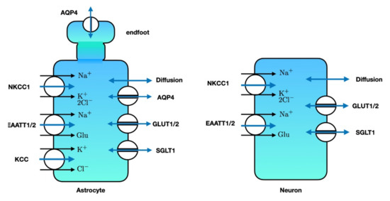 Major transporters and channels that allow water to enter the astrocyte (left) or neuron (right). Single-headed blue arrows denote water co-transport, while double-headed blue arrows denote passive water transport. SGLT: sodium glucose co-transporter. GLUT: glucose transporter. EAAT: excitatory amino acid transporter. NKCC1: sodium-potassium-2 chloride-co transporter. AQP4: aquaporin-4. KCC: potassium-chloride co-transporter. Note that the astrocytic endfeet mainly contain AQP4 for water transport. Illustration adapted from [178,248].