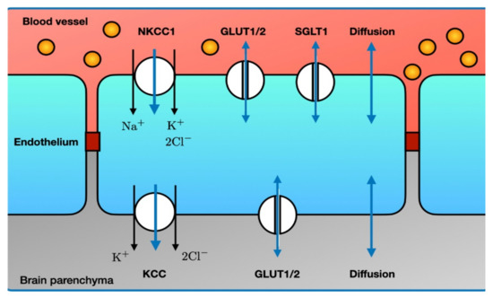 The BBB is a dedicated barrier between the arterial blood flow to the brain and the brain parenchyma, created by functionally asymmetric endothelial cells (Figure 7). At the luminal side, the endothelial cells contain NKCC1, GLUT1/2 and SGLT1. At the abluminal side, the main transporter that co-transports water is KCC. Both endothelial sides also allow water to enter through diffusion.