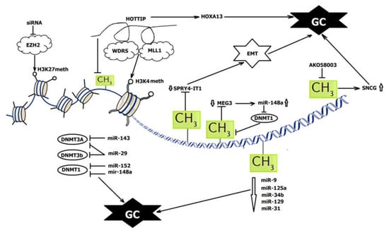 Thus, lncRNAs can both be regulated by DNA methylation and regulate DNA methylation. In this process, some lncRNAs interact with miRNAs and the lncRNA–miRNA–mRNA pathway then includes one more step of epigenetic regulation before modifying target genes in GC tissues [].