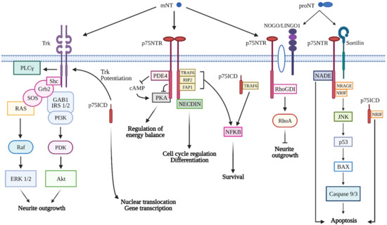 Signaling pathways mediated by neurotrophins’ binding to their receptors. Neurotrophins bind to two main receptor types: Trk receptors and p75NTR. Pro-neurotrophins (proNT) processing generates mature neurotrophins (mNT). Upon mNT stimulation, Trk receptors undergo autophosphorylation events, and recruit adaptor proteins responsible for the activation of MAPKs, PI3K and PLCγ signaling cascades, involved in several neuronal functions such as neurite outgrowth. mNT may also bind to p75NTR, stimulating its proteolysis which releases the intracellular domain (p75ICD) that is essential for signalling and for the regulation of gene transcription. p75NTR activation by mNT may promote neuronal survival by inducing NF-kB signaling. In addition, Necdin recruitment to p75NTR may regulate cell cycle progression and differentiation in a variety of cell types, whereas the interaction with PDE4 and PKA is involved in the regulation of energy balance. Importantly, in dependence on the cell context, p75NTR activation by mNT is able to potentiate the activation of Trk receptors. On the other hand, the binding of proNT to the p75NTR/Sortilin complex enhances the activation of cell-death-related pathways. When p75NTR interacts with NOGO/LINGO1, the recruitment of Rho GDI leads to the activation of RhoA, which in turn determines the inhibition of neurite outgrowth in neurons. FAP1, FAS-associated phosphatase 1; GAB1, GRB2 Associated Binding Protein 1; Grb2, growth factor receptor-bound protein 2; IRS 1/2, insulin receptor substrate 1/2; JNK, c-Jun N-terminal kinases; LINGO1, leucine-rich repeat and Immunoglobin-like domain-containing protein 1; NADE, p75NTR-associated cell death executor; p75NTR, p75 neurotrophin receptor; NRAGE, neurotrophin receptor-interacting MAGE homologue; NRIF, neurotrophin receptor-interacting factor; PDE4, phosphodiesterase 4; PDK, phosphoinositide-dependent kinase; PKA, protein kinase A; PLCγ phospholipase Cγ; RhoA, Ras homolog family member A; RIP2, receptor-interacting protein 2; Shc, SRC homology domain-containing protein; SOS, son of sevenless; TRAF6, TNF receptor-associated factor 6; Trk, tropomyosin receptor kinase. This figure is created with BioRender.