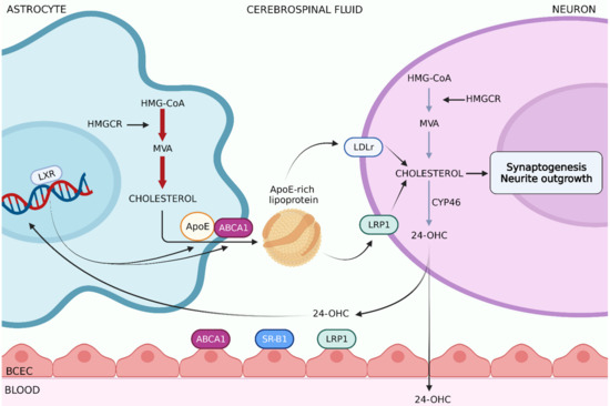 The blood–brain barrier (BBB) efficiently prevents the uptake of lipoproteins from the systemic circulation. Thus, brain cholesterol is produced by means of de novo synthesis in situ, which is finely regulated in diverse brain cells in dependence on the developmental stage [201]. It is widely accepted that during the embryogenesis—before astrocyte’s differentiation—neurons autonomously synthetize cholesterol through the Kandutsch–Russel pathway [202,203]. However, during the postnatal period, neurons decrease or even interrupt their own synthesis whereas cholesterol production becomes particularly lively in astrocytes, through the Bloch Pathway [182,203,204]. Taken together, this evidence strengthens the hypothesis that mature neurons reduce or even abandon cholesterol synthesis to save the energy committed to the generation of the action potentials, thus relying on astrocytes to satisfy their cholesterol needs (Figure 2). Notably, experimental studies have highlighted that mice lacking cholesterol synthesis in adult neurons were phenotypically identical to controls, pointing out how cholesterol synthesis is not a crucial process in adult neurons [205]. In other words, the shutdown of cholesterol synthesis, counterbalanced by the increase in the intercellular trafficking of cholesterol from astrocytes via apoE-rich lipoproteins, ensures the ability to preserve energy in adult neurons for electrical activity. The export process begins in astrocytes, where newly-synthetized cholesterol is transferred by ABCA1 to extracellular lipid-free apoE [206]. Together with apoE, the abca1 gene is expressed through the activation of Nuclear Liver X Receptors (LXRs). These transcriptional regulators sense the rising amount of cholesterol metabolites, such as cytosolic 24(S)-hydroxycholesterol (24-OHC) [182]. Through a feed-forward mechanism, LXRs interact with 24-OHC and other oxysterols inducing the expression of the aforementioned genes [207].