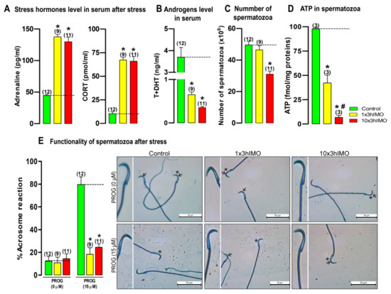 2.1. Repeated Psychophysical Stress Increases the Level of Stress Hormones in Circulation, but Decreases Androgens Levels, as Well as the Functionality, ATP Level and Number of Spermatozoa