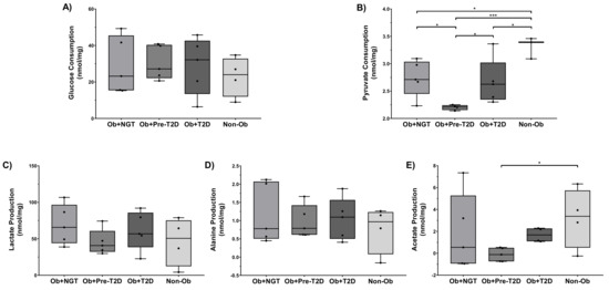 No significant differences in lactate and alanine production were identified between the study groups (Figure 1C,D). Acetate production was significantly lower in Ob+Pre-T2D when compared to Non-Ob (Ob+Pre-T2D: −0.12 ± 0.28 nmol/mg of WVAT vs. Non-Ob: 3.21 ± 1.37 nmol/mg of WVAT, p < 0.05) (Figure 1E).