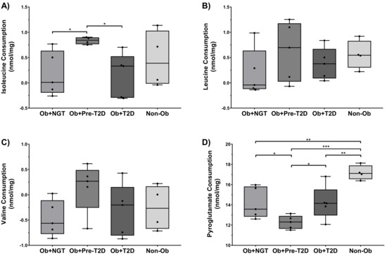 Isoleucine (A), leucine (B), valine (C) and pyroglutamate (D) consumption by visceral adipose tissue (VAT) explants. Subjects were grouped according to body mass index (BMI) and glycemic status (with obesity and euglycemia-Ob+NGT; with obesity and pre-diabetes-Ob+Pre-T2D; with obesity and T2D-Ob+T2D; without obesity-Non-Ob). Data are presented as boxplots with quartiles and all points plotted. * p < 0.05; ** p < 0.01; *** p < 0.001.