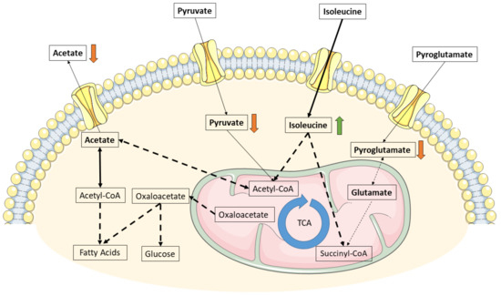 Putative metabolic fates of acetate, pyruvate, isoleucine and pyroglutamate in the VAT of subjects with obesity and pre-diabetes. Isoleucine consumption feeds the increased gluconeogenic flux and the tricarboxylic-acid cycle (TCA), compensating for the lower influx of pyruvate and pyroglutamate. Lower acetate production to the extracellular medium could derive from increased intracellular consumption to promote de novo lipogenesis. Thicker arrows show increased flux; dashed lines denote simplified pathways.