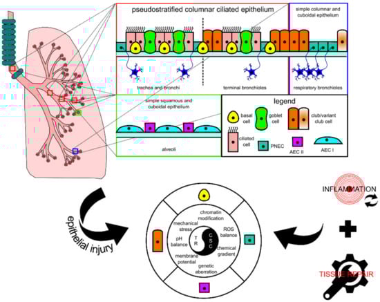 When the lungs suffer an injury, several lung resident cells such as basal cells, club cells, variant club cells, and AEC II cells could act as facultative stem cells to repair damage by repopulating lost cells []. PNECs can also take part in repopulating ciliated and club cells in naphthalene-induced injury []. These cells’ activity is lineage-committed, which means that their renewal function is induced at the respective location where they are residing. However, recent progress in the identification of progenitor cell candidates for lung injury repair points to the involvement of other cells, such as the lineage-negative epithelial progenitor (LNEP) cell, a basal cell progenitor termed the bronchial epithelial stem cell (BESC), and a subset of the AEC II cell population termed alveolar epithelial progenitor (AEP), in repairing distal lung epithelium [,,]. These cells together with the well-studied facultative stem cells are key candidates for the emergence of CSCs because their proliferative activity is mostly injury-triggered and their activity coincides with other tumor-supporting events that occur after injury consisting of DNA damage and tissue repair-associated inflammation. Given the unique cellular turnover rate of lung epithelium and potent repair capacity during injury, these cells fulfill several premises to be defined as lung CSCs: (1) they are long-lived; (2) they are mostly quiescent; (3) they can survive mild or severe injury; (4) they are known to have the potency to differentiate and proliferate for both homeostasis and injury repair []. Based on the similarities in the location and protein markers, lung progenitors as key players for tissue repair have clear connections with CSCs of lung carcinomas, thus explaining the overlapping between tissue repair and carcinogenesis.