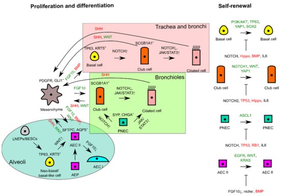 The signaling pathways regulating self-renewal and overall interactions of lung epithelial residents for proliferation and differentiation are simplistically summarized in Figure 2.