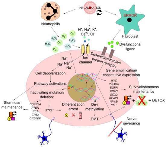 Additionally, due to the damaging nature of chronic inflammation, surrounding supporting structures such as the nerve, which functions to communicate long-range bioelectric positional and identity cues, could be cut off, which leads to interruption of the communication. Indeed, as reported in the insect Leucophaea maderae, severance of recurrent nerves led to a high incidence of tumor development []. In the lung, this situation can be especially relevant for PNECs as they are known to be innervated.