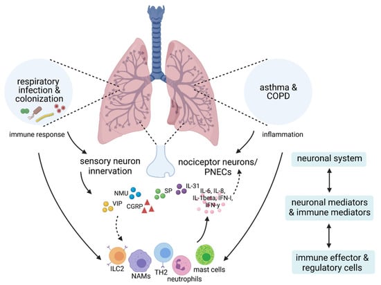 Chicago/Turabian StyleCamp, Belinda, Sabine Stegemann-Koniszewski, and Jens Schreiber. 2021. "Infection-Associated Mechanisms of Neuro-Inflammation and Neuro-Immune Crosstalk in Chronic Respiratory Diseases" International Journal of Molecular Sciences 22, no. 11: 5699. https://doi.org/10.3390/ijms22115699