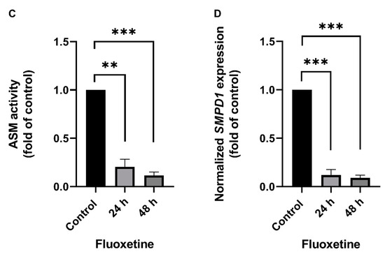 Human PBMCs were isolated from the full blood of two healthy volunteers by Ficoll density-gradient centrifugation, cultured, and one time stimulated with 10 µM fluoxetine or PBS. ASM activity was inhibited after the single fluoxetine stimulation as compared with controls (Figure 1C, F(2, 3) = 195.0, p < 0.001). The post hoc analysis revealed a significant decrease 24 h (Tukey, p < 0.01) and 48 h after fluoxetine stimulation as compared with controls (p < 0.001). No statistically significant difference was observed between the two time points (p = 0.30). SMPD1 transcription was significantly decreased after the single stimulation as compared with controls (Figure 1D, F(2, 3) = 400.9, p < 0.001). The post hoc analysis showed a significant decrease 24 h (Tukey, p < 0.001) and 48 h after stimulation (p < 0.001). No statistically significant difference was observed between the two time points (p = 0.72). Thus, the FIASMA fluoxetine inhibited ASM activity in primary cells and also decreased SMPD1 mRNA expression after a single stimulation. This effect seems to be reversible, in terms of ASM activity as well as SMPD1 mRNA expression.
