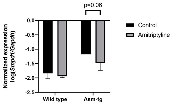 The transgenic Asm-tg mice used in our study overexpress Asm constitutively, resulting in depressive-like symptoms [19,21]. The genetic strategy of the Asm-tg mouse model implies an increase in Smpd1 mRNA expression as compared with wild-type mice. To determine the effect of antidepressant treatment on Smpd1 mRNA expression, we investigated the Smpd1 mRNA expression profiles of Asm-tg and wild-type mice after a daily treatment for four weeks with the common antidepressant amitriptyline as compared with control groups that received water. We analyzed brain tissue from the dorsal and ventral hippocampus and the frontal cortex. In the dorsal hippocampus, Smpd1 mRNA expression levels differed significantly among the four experimental groups, i.e., wild-type control (n = 6), wild-type amitriptyline-treated (n = 5), Asm-tg control (n = 5), and Asm-tg amitriptyline-treated (n = 5) (2-way ANOVA, genotype effect, F(1, 17) = 38.24, p < 0.0001 and treatment effect, F(1, 17) = 5.07, p < 0.05, Figure 2). The strong genotype effect confirmed the genetic strategy of the mouse model. Regarding treatment, the post hoc analysis revealed a trend of decreased Smpd1 mRNA expression in MDD Asm-tg amitriptyline-treated mice as compared with ASM-tg control mice (Sidak, p = 0.06). Treatment with amitriptyline did not affect Smpd1 mRNA expression in wild-type mice (Sidak, p = 0.68). The treatment effect observed in Asm-tg mice was specific to the dorsal hippocampus, as these effects could not be detected in the ventral hippocampus and the frontal cortex (data not shown). Thus, Smpd1 mRNA expression was decreased by FIASMA treatment in vitro and in vivo.