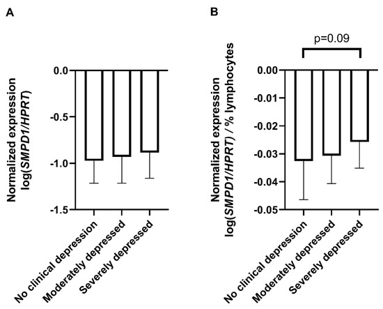 SMPD1 mRNA expression in blood cells of unmedicated depressed patients and healthy controls. (A) No differences between depressed patients and healthy controls. SMPD1 mRNA expression did not differ between healthy and moderately or severely depressed patients; (B) Impact of lymphocyte percentage on SMPD1 expression differences between depressed patients and healthy controls. When taking the lymphocyte percentage into account, there was a trend in our sample towards an increase in SMPD1 mRNA expression in severely, but not moderately depressed patients as compared with individuals without clinical depression. Data represent the mean and SD.