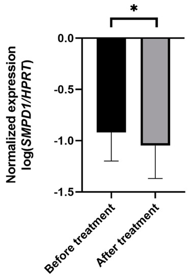 Effects of antidepressant treatment on SMPD1 mRNA expression. Unmedicated MDD patients displayed significantly higher SMPD1 mRNA expression before treatment as compared with after treatment. Data represent the mean and SD. * p < 0.05.