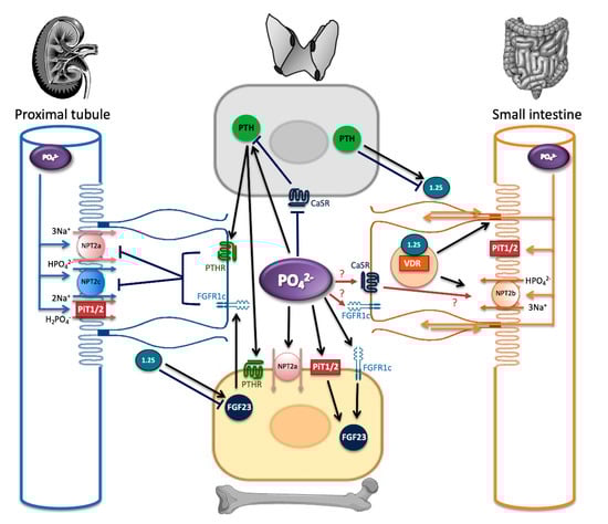 Sensing the variations in extracellular phosphate concentrations and informing the cell of such changes is defined by the term “phosphate sensing.” Although the existence of such a mechanism has been acknowledged for decades, the underlying physiological, endocrine, cellular, and molecular mechanisms are poorly understood and are only beginning to be slowly deciphered. Phosphate sensing may involve a single cell, a whole organ, or a combination of different organs and factors. At the whole-body level, phosphate sensing is the first step of phosphate homeostasis regulation. When extracellular phosphate varies, key phosphate sensing cells may induce subsequent local or endocrine responses. For example, the idea that the intestinal epithelium can sense phosphate and signal to the kidney to maintain phosphate balance has been proposed. In 2007, Berndt et al. suggested that a gut-derived factor is released in response to ingestion of dietary phosphate and that this factor rapidly modulates renal phosphate reabsorption to prevent large post-prandial fluctuations in serum phosphate []. Subsequent studies have been unable to confirm the existence of this “intestinal phosphatonin” [,] and have instead found that acute renal adaptation to an oral phosphate load requires a parathyroid–kidney and a bone–kidney axis. FGF23, synthetized by osteocytes, and PTH, synthesized by the parathyroid glands, are secreted in response to the increase in extracellular phosphate [] and act to decrease renal phosphate reabsorption and restore phosphate homeostasis [,,]. Calcitriol, a third circulating factor produced by 1alpha hydroxylation of 25OH vitamin D in proximal tubular cells, is also involved in the regulation of extracellular phosphate. PTH increases calcitriol production, which in turn increases intestinal phosphate absorption (through NPT2B) [], and thus may appear to be counterproductive to the maintenance of phosphate balance. This effect, however, is counterbalanced by the feedback loop of calcitriol on PTH synthesis, its positive effect on bone formation, and its stimulation of FGF23 synthesis []. These loops of regulation maintained by these three circulating factors involve at least three different phosphate sensor candidates: the sodium phosphate co-transporter PiT2, the calcium sensing receptor (CaSR), and the FGF receptor 1 (FGFR1c).