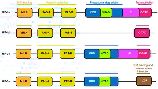 Domain structures of HIF-1α in comparison with other HIF proteins and their potential function. Different functions of various domains are represented at the top. All HIF isoforms have a bHLH motif and two PAS domains (PAS-A and PAS-B) for the heterodimerization. HIF-1β does not contain the oxygen-dependent degradation (ODD) domain, that mediates proteasomal degradation, N-TAD, and the inhibitory domain (ID). Isoform HIF-3α, without the C-TAD which mediates transcriptional activation and ID, shows a LZIP involved in DNA binding and protein–protein interaction.
