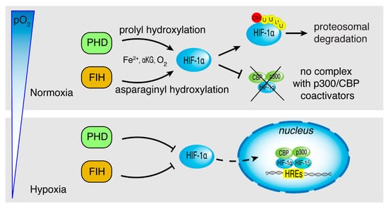 Oxygen-dependent regulation of HIF-1α. Under normoxia (upper panel), HIF-1α proline hydroxylation promotes proteasomal degradation, while HIF-1α asparagine hydroxylation blocks CBP/p300 binding, thus impairing HIF-1α function. Both prolyl (PHD) and asparaginyl (FIH) hydroxylases require Fe(II), O2, and α-ketoglutarate (αKG). Under hypoxia (lower panel), HIF-1α is not hydroxylated, and its nuclear translocation allows the dimerization with HIF-1β, the combining with the coactivators CBP/p300, and thereby, the binding to hypoxia response elements (HREs), increasing the transcription of target genes.