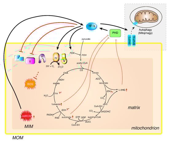 Among the cellular components, mitochondria are the major consumers of oxygen since they drive cellular bioenergetics, therefore they are severely damaged by decreased oxygen availability. In response to hypoxia, mitochondria adjust their metabolism in different ways, including exchanging or modifying subunits of the respiratory chain, decreasing oxidative phosphorylation (OXPHOS), lowering the tricarboxylic acid (TCA) cycle intermediates, adapting reactive oxygen species (ROS) production, and reducing β-oxidation [9]. Another adaptive response of mitochondria to hypoxic condition involves a reduction of their mass by an autophagy mechanism and inhibition of their biogenesis [10]. Moreover, mitochondrial TCA cycle intermediates participate in modulating the hypoxia-inducible factors (HIF), the key regulators of adaption to hypoxia.