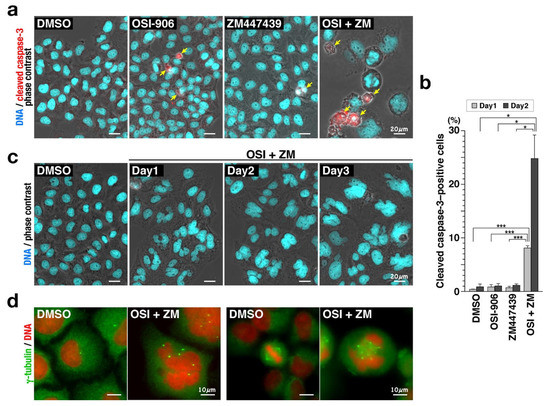 Combination of OSI-906 and ZM447439 generates enlarged cells with aberrant-shaped nuclei. HeLa S3 cells were treated with 3 µM OSI-906, 1 µM ZM447439, or their combination for 3 days. The cells were fixed with methanol for 5 min at −30 °C (a,c,d) or 4% formaldehyde for 20 min at room temperature (b). (a) The fixed cells (Day3) were stained for cleaved caspase-3 (red) and DNA (cyan). Representative images of cells treated with OSI-906, ZM447439, or their combination (OSI + ZM) are shown. Dimethyl sulfoxide (DMSO) was used as solvent control. Yellow arrows indicate cleaved caspase-3–positive cells. Scale bar, 20 µm. (b) On day 1 and day 2, the cells were fixed and stained for cleaved caspase-3 and DNA. The number of cleaved caspase-3–positive cells were counted and plotted as the mean ± SD calculated from three independent experiments (n > 201). p-values were calculated using Tukey’s multiple comparison test (Day1) and the Games–Howell multiple comparison test (Day2). * p < 0.05; *** p < 0.001. (c) The fixed cells were stained for DNA (cyan). Representative images of cells treated with the combination (OSI + ZM) for 1–3 days are shown. Scale bar, 20 µm. (d) The fixed cells (Day3) were stained for γ-tubulin (green) and DNA (red). Representative images of γ-tubulin in interphase (left) and M phase cells (right) treated with the combination (OSI + ZM) are shown. Scale bar, 10 µm.